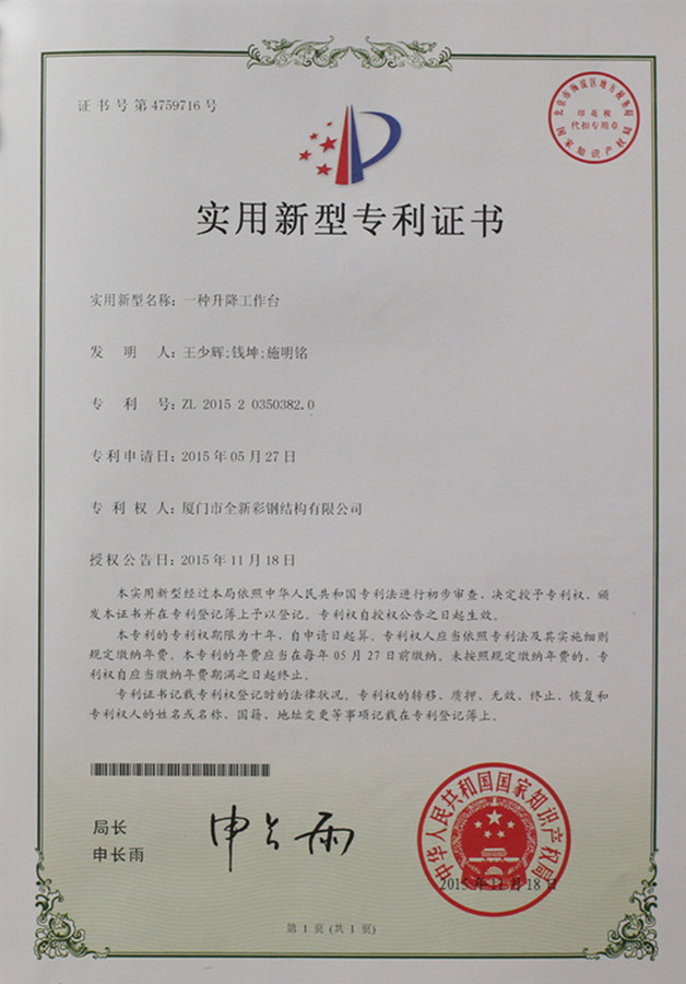 Патентное свидетельство на подъемную платформу